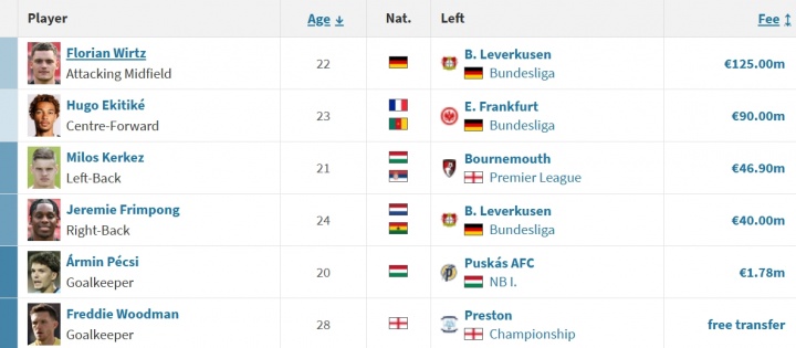 本-多克→伯恩茅斯,2900万欧(HWG未官宣)