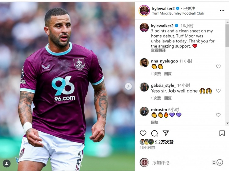 沃克社媒:主场首秀全取三分+零封,感谢球迷的复旧