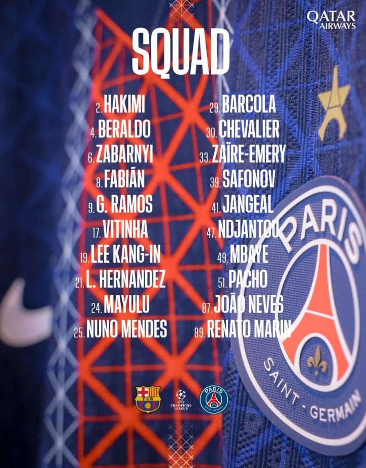 9月30日讯 本轮欧冠迎来焦点战巴黎对阵巴萨,巴黎官方也公布了球队本场大名单,登贝莱、K77缺席,内维斯、法比安回来,具体如下: