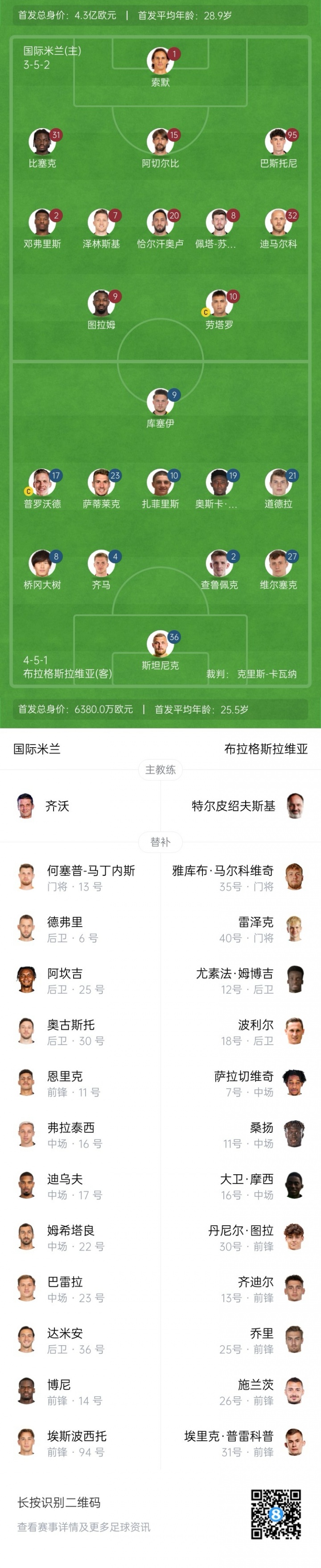 海外米兰首发:1-索默、15-阿切尔比、31-比塞克、32-迪马尔科、95-巴斯托尼、2-邓弗里斯、7-泽林斯基、8-苏西奇、20-恰尔汗奥卢、9-图拉姆、10-劳塔罗