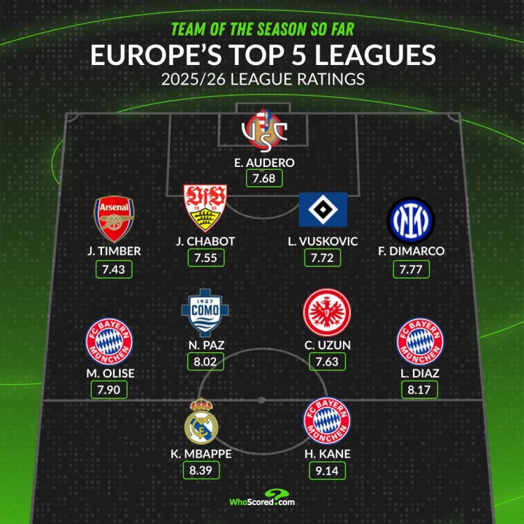 WhoScored本赛季于今五大联赛最好阵:姆巴佩、凯恩、迪亚斯在列