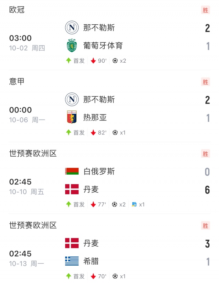 霍伊伦今夏从曼联租出至那不勒斯,新赛季情状火热,各赛事为那不勒斯出战6场打进4球,国度队方面则已4场造5球(4球1助)。