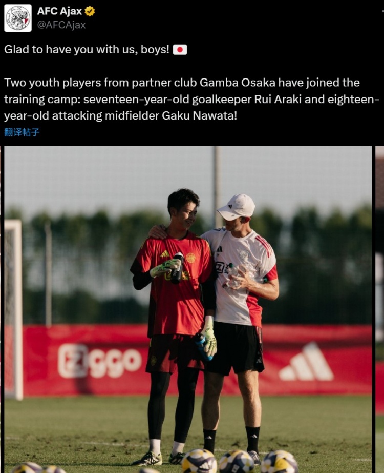 阿贾克斯官推清楚,来自互助俱乐部大阪钢巴的两名后生球员加入了查验营,他们分歧是17岁的门将荒木瑠衣和18岁的报复型中场绳田岳。