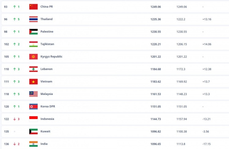 10月17日讯 FIFA更新最新一期国度队排行,亚足联国度队方面,国足积分不变,但排行从寰宇第94位升至寰宇第93位,亚洲排行则一经第14位。