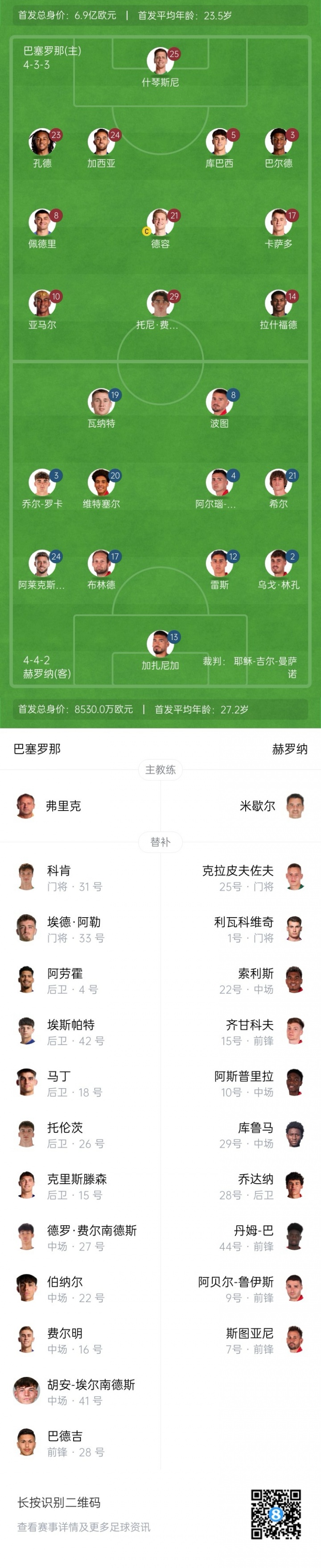 巴萨替补:31-迭戈·科肯、33-阿勒、4-阿劳霍、15-克里斯滕森、18-杰拉德·马丁、26-托伦茨、16-费尔明、22-伯纳尔、27-德罗·费尔南德斯、28-巴德吉、41-胡安、42-埃斯帕特