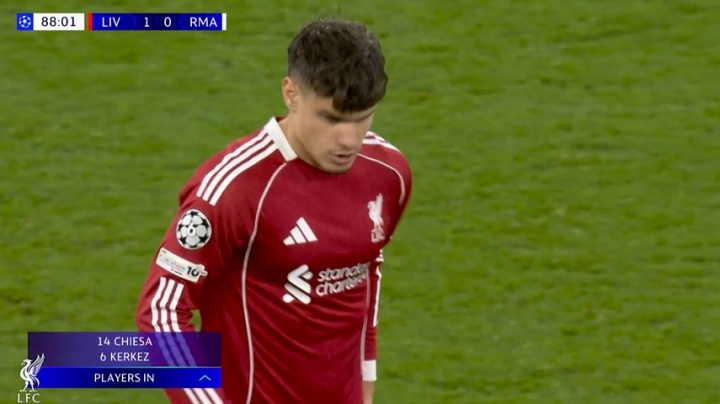 11月05日讯 欧冠第4轮利物浦vs皇马第89分钟,利物浦再次作念出2个换东说念主缓助,维尔茨、罗伯逊被换下,凯尔凯兹、基耶萨替补登场。