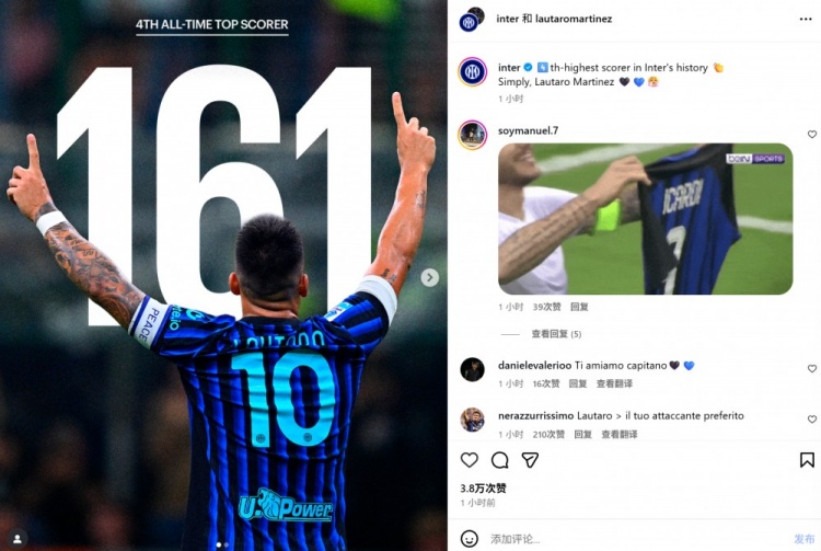 161球并列队史弓手榜第4!劳塔罗社媒转发数据并晒庆祝照驰念