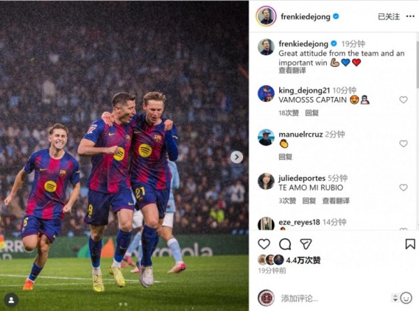 染红离场!德容社媒庆祝取胜:球队展现很棒的魄力,成绩紧迫收效