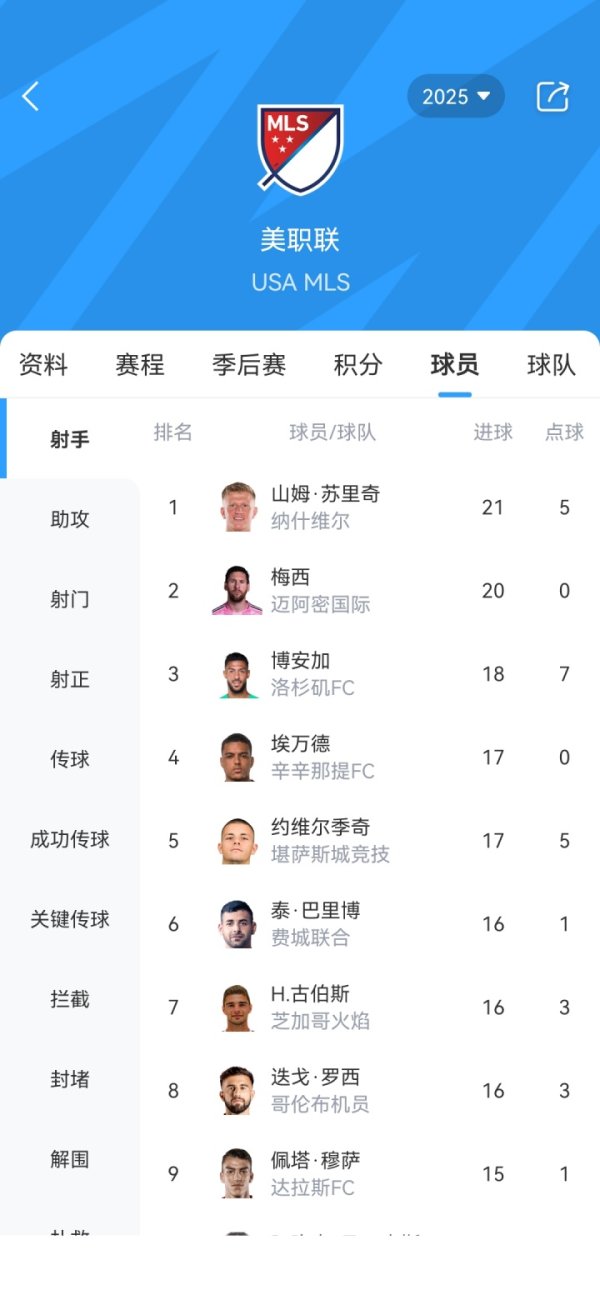 好意思职联弓手榜:梅西21场20球第2,纳什维尔时尚苏里奇21球领跑