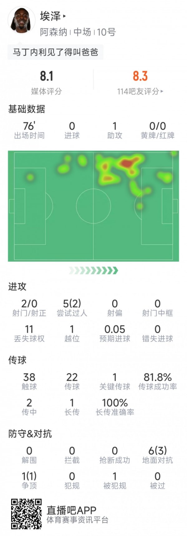 飞速融入!埃泽本场数据:1次助攻 ,2次射门,8次挣扎5次收效