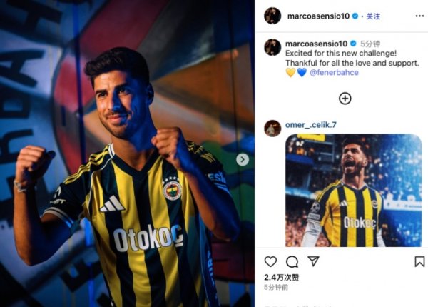 阿森西奥社媒晒费内巴切球衣照:很振奋迎来全新挑战,感谢救援