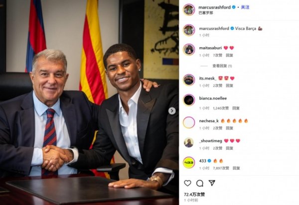 7月24日讯 巴萨还是官宣引进曼联前卫拉什福德,后者也社媒晒照缅念念。 拉什福德先是晒出了我方和拉尔波塔的签约照,并配文:“巴萨万岁!” 随后又晒出我方的登生动态,并示意:“感谢你们如斯强烈的接待!咱们很快再会!” 巴萨从曼联租赁27岁前卫拉什福德,租期至2026年6月30日,交游附带买断选项,拉什福德将穿巴萨14号球衣。......查看更多