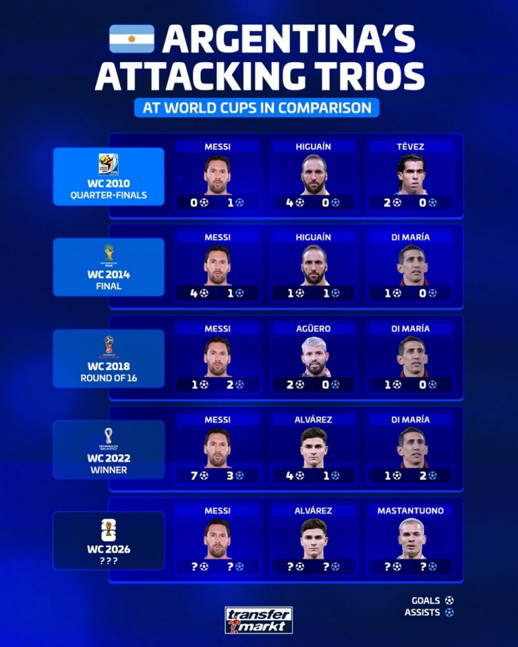 2022(冠军)——梅西(7球3助)、阿尔瓦雷斯(4球1助)、迪马利亚(1球2助)