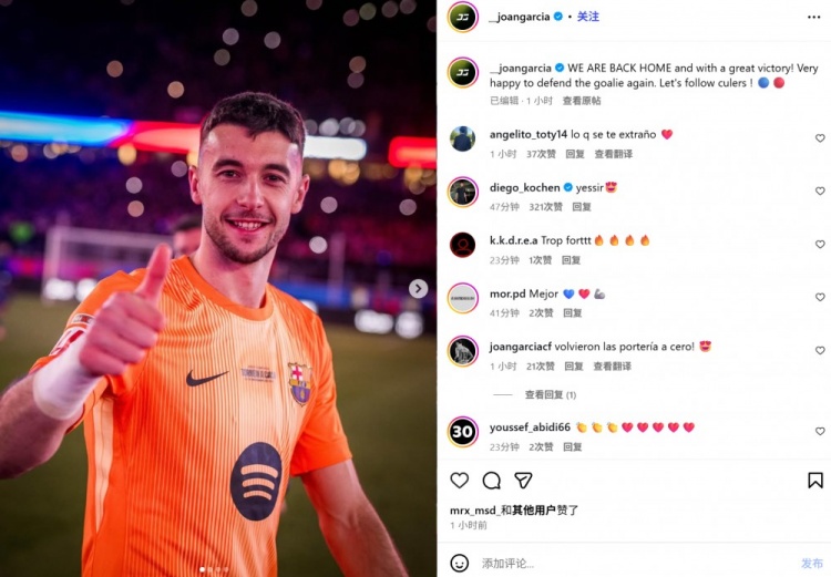 他也在赛后通过社媒晒出我方的庆祝照,并配文:“咱们回家何况获取了一场大捷!很欢叫再次捍卫球门!让咱们连接前进,巴萨球迷们!🔵🔴”