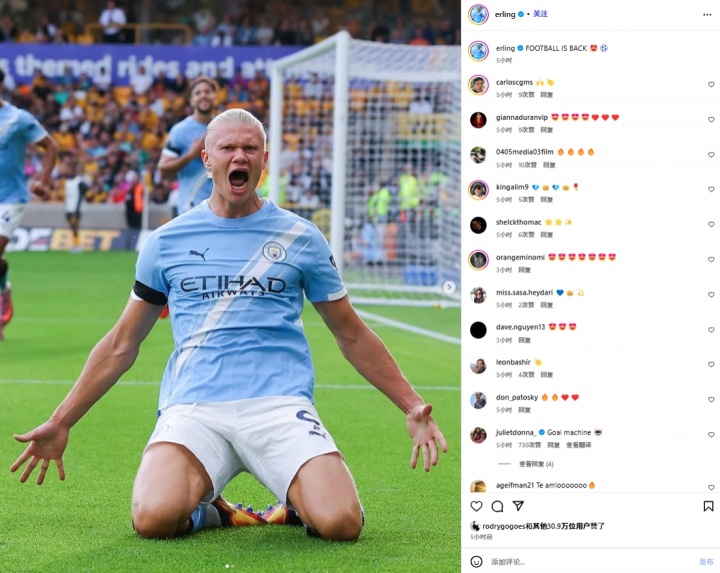 哈兰德更新社媒庆祝英超开门红,罗德里戈点赞