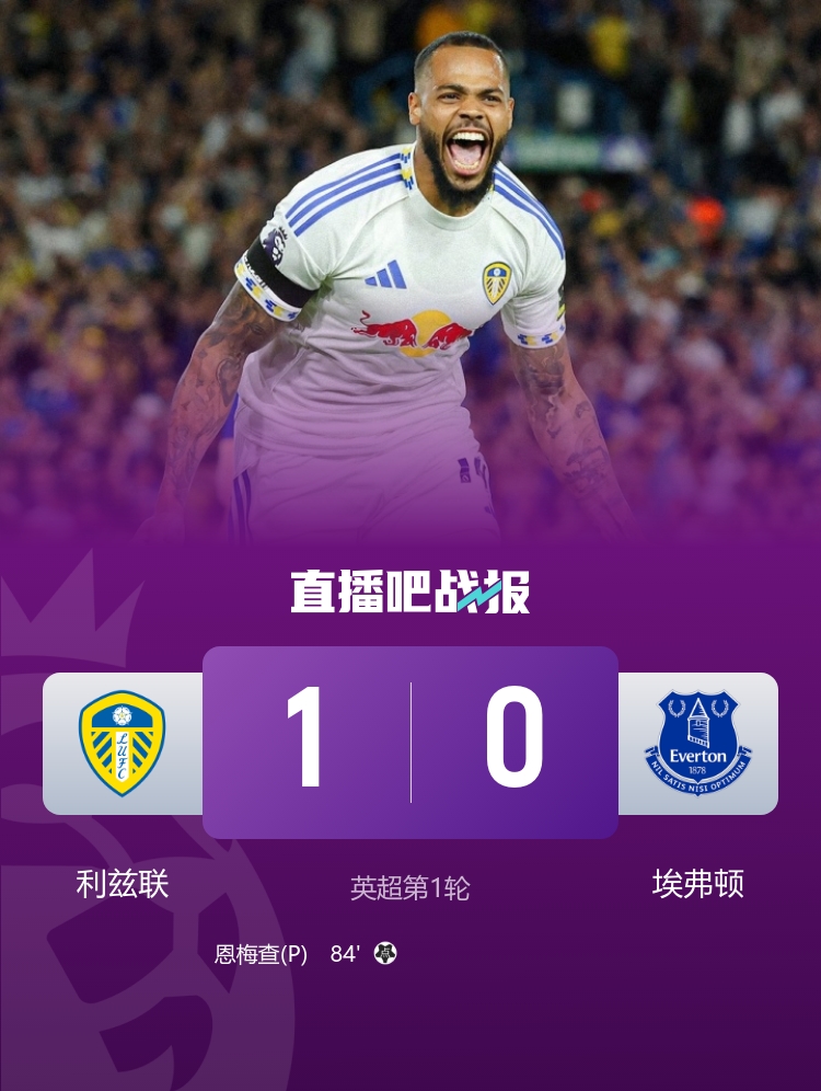 英超第1轮,利兹联在埃兰路球场1-0校服埃弗顿,利兹联时尚恩梅查在84分钟打进制胜点球。