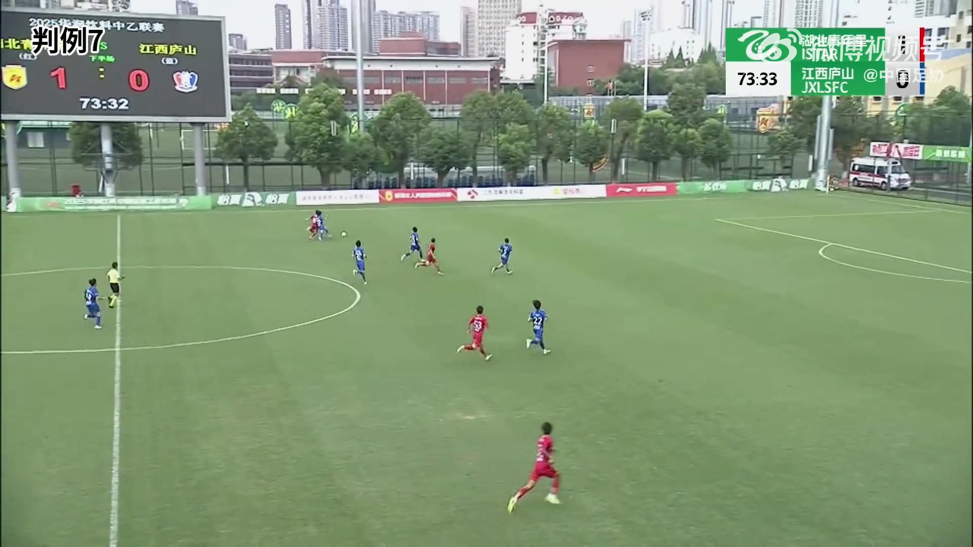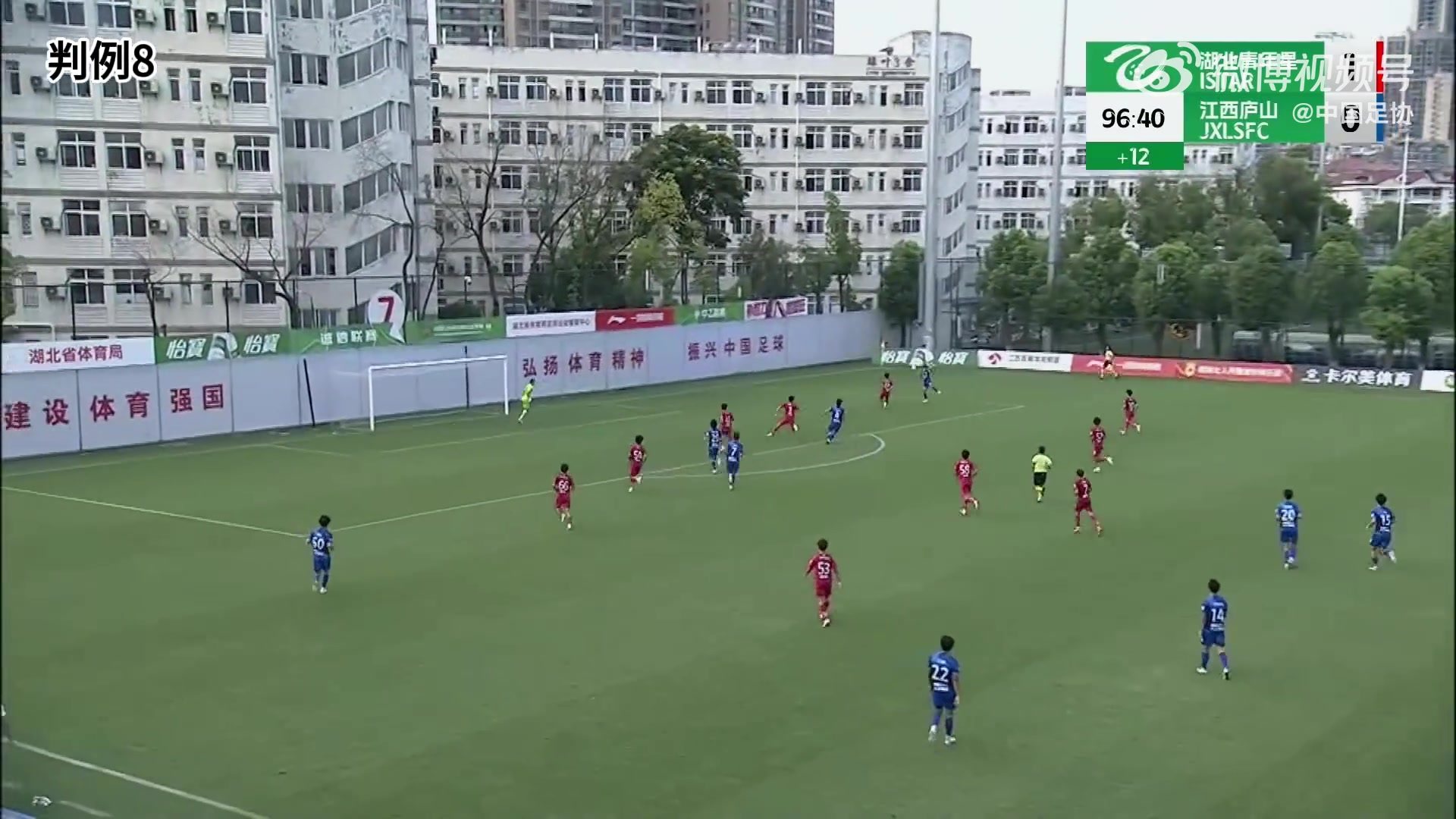 判例八:中乙联赛第21轮,湖北后生星VS江西庐山,比赛第90+7分钟,湖北后生星3号队员在本方罚球区内着重江西庐山队4号队员时,后者倒地,评判员判湖北后生星3号犯规并判罚球点球。