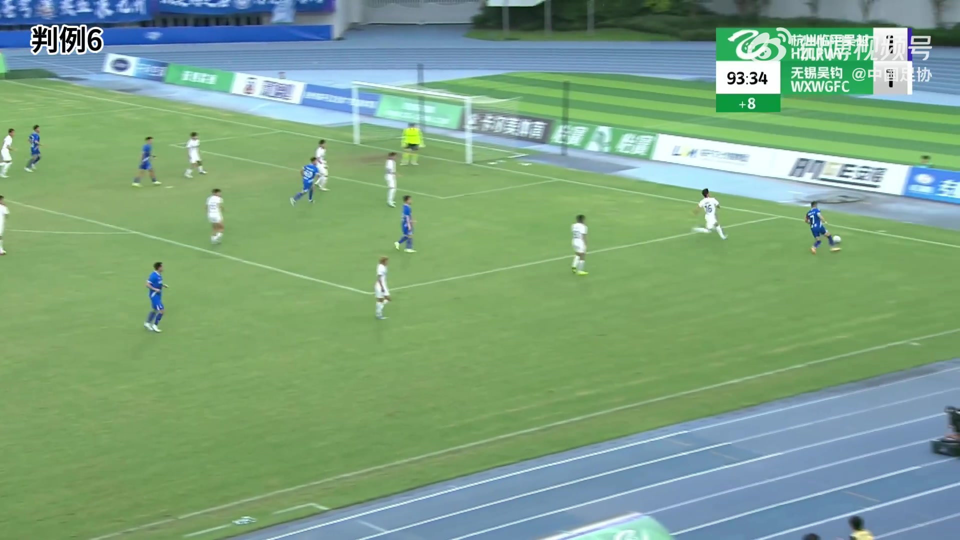 判例六:中乙联赛第21轮,杭州临平吴越VS无锡吴钩,比赛第90+4分钟,杭州临平吴越队员蹙迫中下底传中,同队队员头球进球,助理评判员暗示传中经过中球的举座已离开比赛场面(出界),评判员判进球无效。