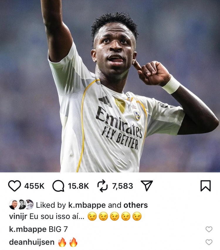 维尼修斯社媒晒照庆祝告捷,姆巴佩点赞批驳:BIG 7