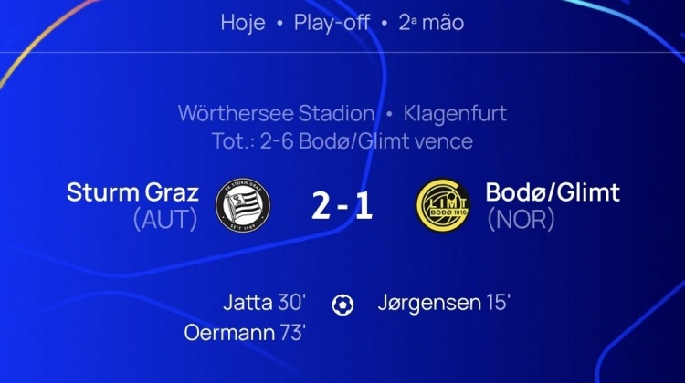 尽管次回合1-2输球,但博德醒目总比分6-2淘汰格拉茨风暴,赢得欧冠正赛履历。