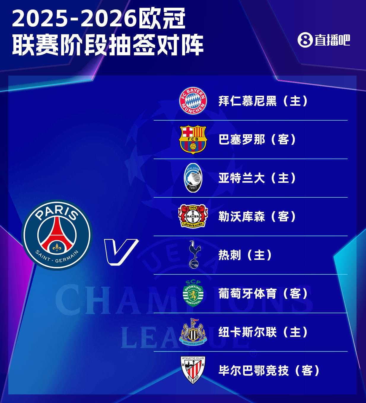 8月29日讯 25-26赛季欧冠联赛阶段抽签,巴黎联赛阶段8支敌手出炉。