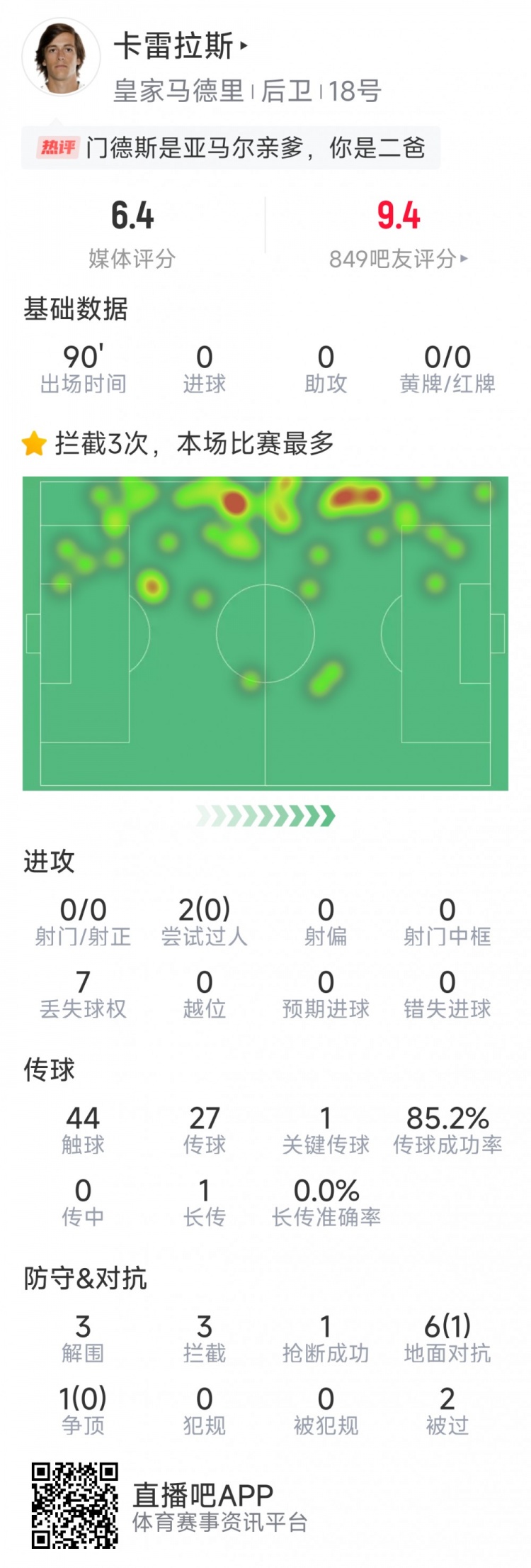 10月27日讯 在本轮西甲,皇马2-1打败巴萨。以下为卡雷拉斯本场数据: