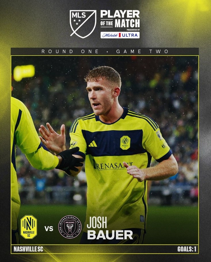 扫射破门,官方:乔什-鲍尔当选纳什维尔2-1迈阿密外洋全场最好