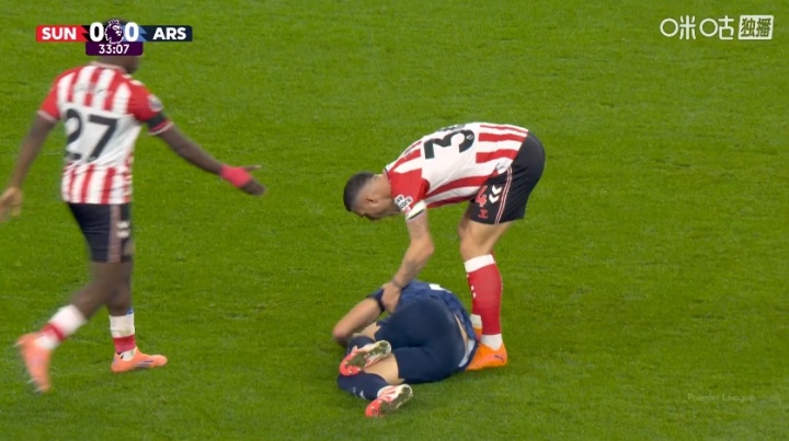 不悦!桑德兰进球前,扎卡放倒反击中的梅里诺,对其贴脸怒喷
