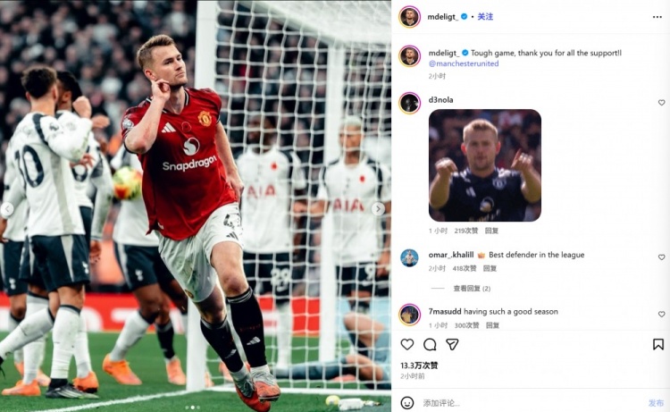 德里赫特社媒晒庆祝照:重荷的比赛,感谢曼联球迷们的撑握