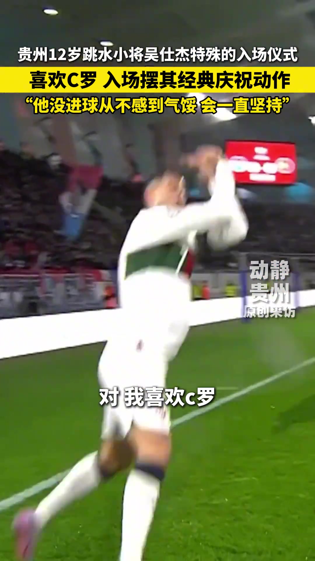 11月13日讯 贵州12岁跳水小将吴仕杰入场时师法C罗经典庆祝作为。