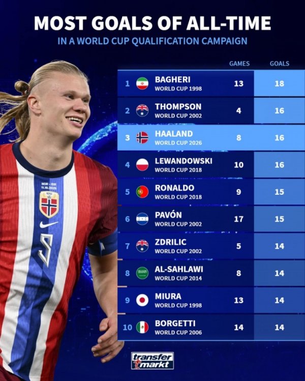 11月18日讯 德国转会市集统计了球员在单届世初赛中的进球数目,比肩出榜单,哈兰德本届世初赛打进16球名次比肩第二位。 单届世初赛进球榜: 1998年寰球杯预选赛——巴盖里(伊朗)——13场18球 2002年寰球杯预选赛——汤普森(澳大利亚)——4场16球 2026年寰球杯预选赛——哈兰德(挪威)——8场16球 2018年寰球杯预选赛——莱万(波兰)——10场16球 2018年寰球杯预选赛——C罗(葡萄牙)——9场15球 2002年寰球杯预选赛——帕文(洪齐拉斯)——17场1......查看更多