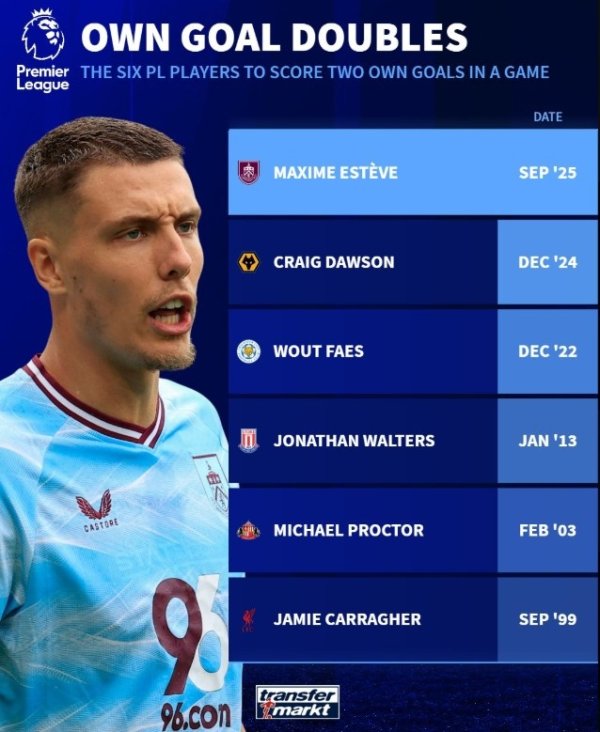 英超单场乌龙双响“倒霉蛋”:卡拉格、艾斯特福、说念森、法斯在列