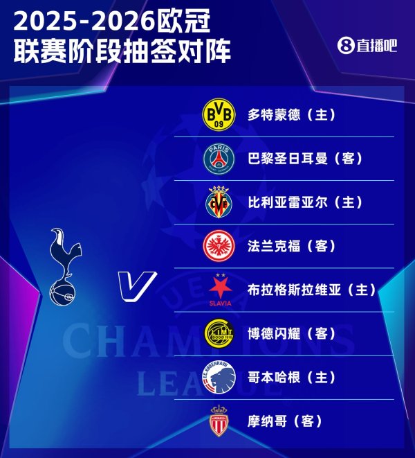 热刺欧冠联赛阶段:多特、巴黎、法兰克福、摩纳哥等8队