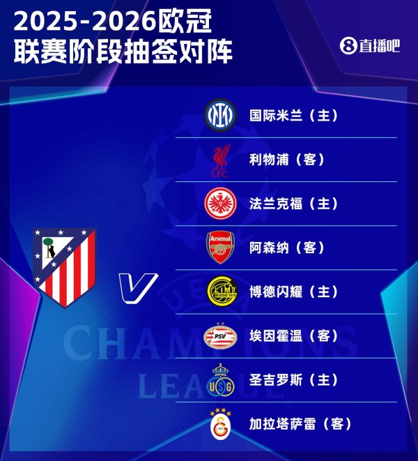 马竞欧冠联赛阶段:国米、利物浦、阿森纳、法兰克福等8队