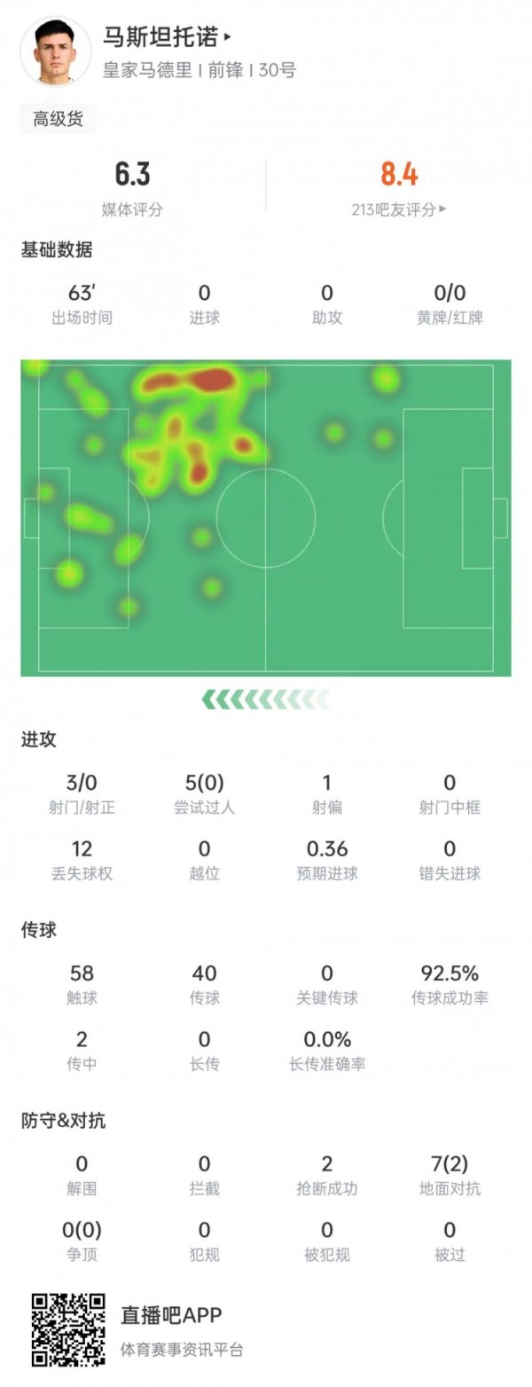 马斯坦托诺本场数据:3次射门0射正&5次过东说念主0见效,6.3分全队最低