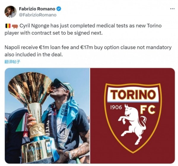 罗马诺:那不勒斯边锋恩贡戈已完成体检,将与齐灵签署租赁左券