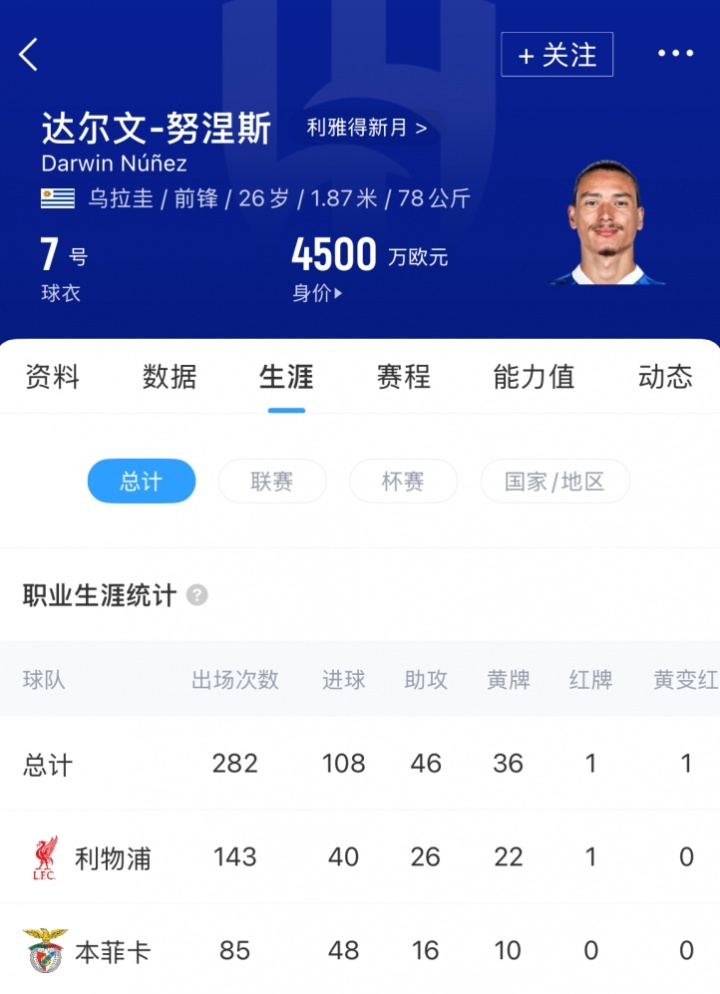 努涅斯自2022年从本菲卡转会以来,共为利物浦出场143次。上赛季他出战了30场联赛,但其中仅8次首发,并在球队获取英超冠军的赛季中打入5球。努涅斯现年26岁,现在德转估值4500万欧。