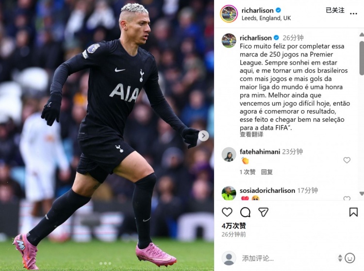 理查利森赛后也在社媒晒出本场相片,配文写谈:“很应承能在英超联赛中完成250场里程碑。我一直梦思着能在这里踢球,成为辞寰宇顶级联赛中出场次数最多、进球最多的巴西球员之一是我的运道。更令东谈主应承的是,今天咱们获得了一场深奥的比赛,是以当今要庆祝这一切,并以最好气象招待国度队比赛日。”