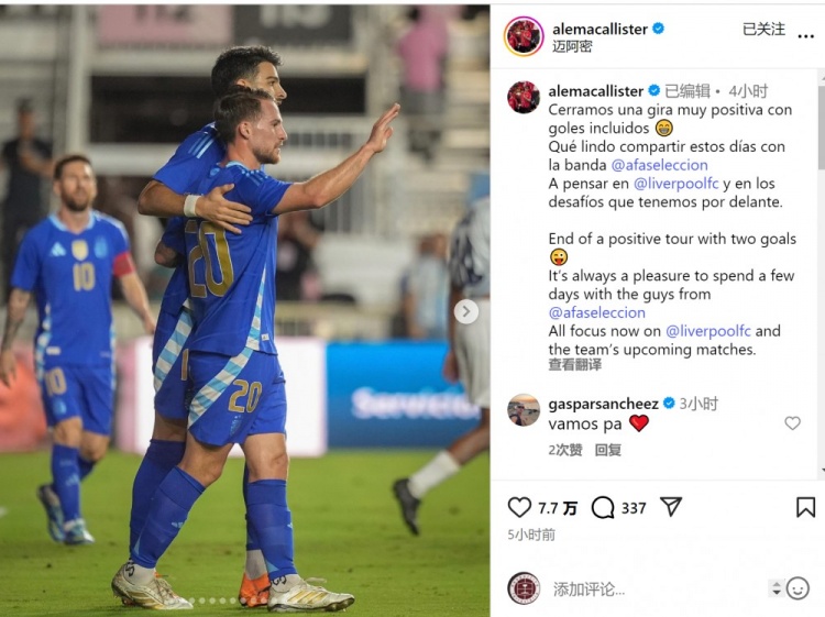 麦卡利斯特社媒晒出比赛相片,并写谈:“以两粒进球贬抑了积极的海外比赛日之旅,与国度队伙伴们共度数日时光老是令东谈主感到惬心。”