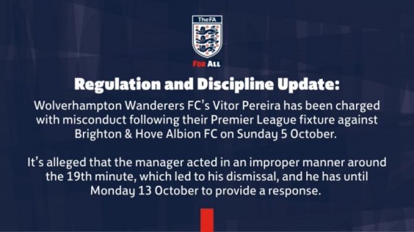 10月9日讯 在本轮英超狼队对阵布莱顿的比赛中,狼队主帅佩雷拉在第21分钟被出示红牌。 日前,英足总官方发布公告:“狼队主帅佩雷拉在10月5日周日对阵布莱顿的英超联赛后被指控行径不当。据称,佩雷拉在第19分钟控制行径不当,这导致他被罚下场,他需在10月13日周一前对此作出呈报。” 有关新闻:英超官方解释狼队主帅佩雷拉染红:他在阐扬注解席作念出永诀适行径......查看更多