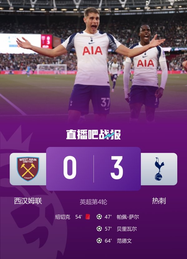 刷新记载!热刺队史初次在英超客场赢西汉姆联至少3球