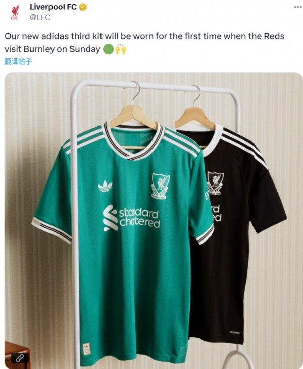 利物浦官方:球队将在本轮对伯恩利初次身披绿色第二客场球衣