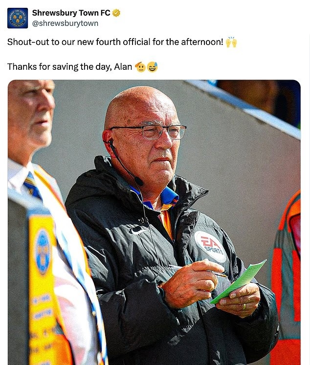 什鲁斯伯里在社媒上发布像片并写说念:“向咱们今世界午的新第四官员致意!谢谢你救场,艾伦。”