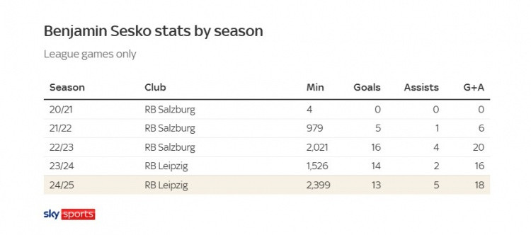 聘请签下塞斯科而非更熟识的选项存在一定风险。他莫得哈兰德当初转会英格兰时那样高产高效的进球记录。哈兰德在多特蒙德89场比赛中打入了86球,而塞斯科在莱比锡87场比赛中打入39球。