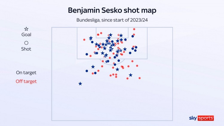 另一方面,塞斯科得志从顽恶角度和不太可能的位置起脚射门,但或然进展也会令东说念主衰颓。他以前两个德甲赛季的射门点位图裸露,从数据上看,他很大比例的射门调动为进球的概率其实并不高。
