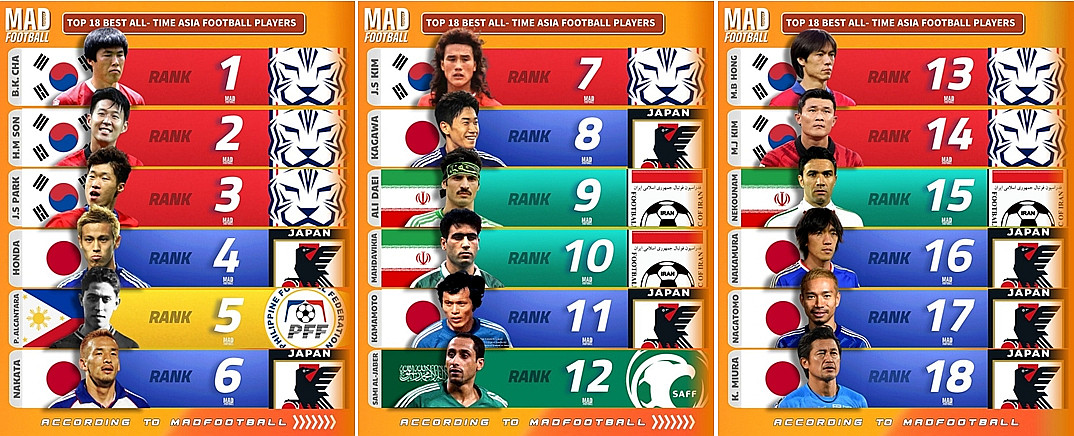 这份榜单上有7名日本球员、6名韩国球员、和3名伊朗球员,沙特和菲律宾球员各1东说念主。车范根、孙兴慜和朴智星名次前三,本田圭佑、中田英寿、阿尔坎塔拉、冈崎慎司、内科南和马达维基亚等东说念主紧随后来。