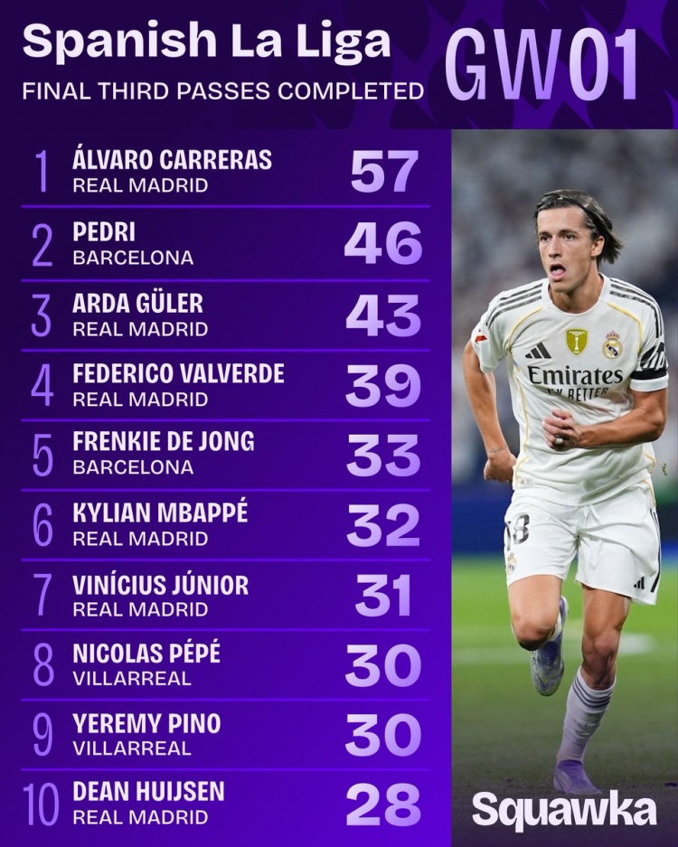 8月21日讯 西甲首轮战罢,Squawka统计球员在紧要三区完成传球次数,A费57次居首,佩德里、居勒尔分列二三位。