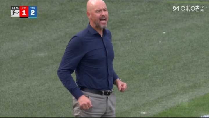 08月23日讯 德甲首轮,勒沃库森vs霍芬海姆,比赛第53分钟,霍芬海姆再入一球,勒沃库森连丢两球1-2遭反超,主帅滕哈赫在场边相配动怒。