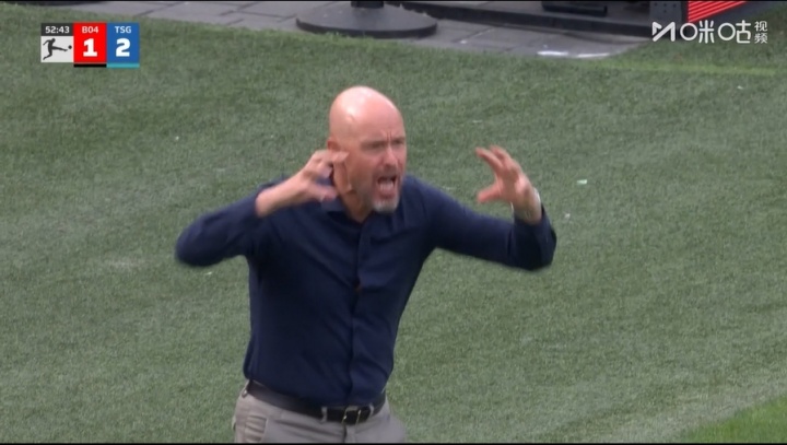 相配动怒!勒沃库森连丢两球被反超,滕哈赫场边作念手势抒发动怒