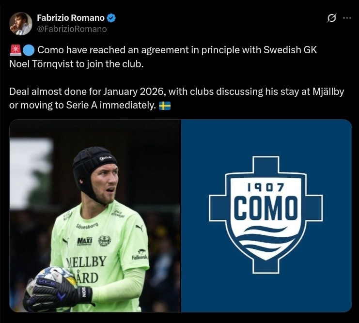 8月25日讯 据着名转会内行罗马诺报谈,科莫依然与瑞典门将诺埃尔-托尔奎斯特已毕原则性一致。